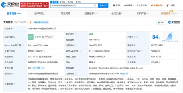 客畅网5月8日资讯,企业信息平台数据显示,知名零售企业胖东来近期完成多类别商标布局,包含"于东来""东来哥"等名称及"自由爱之城"系列标识,覆盖商业推广、文化娱乐等经营领域。