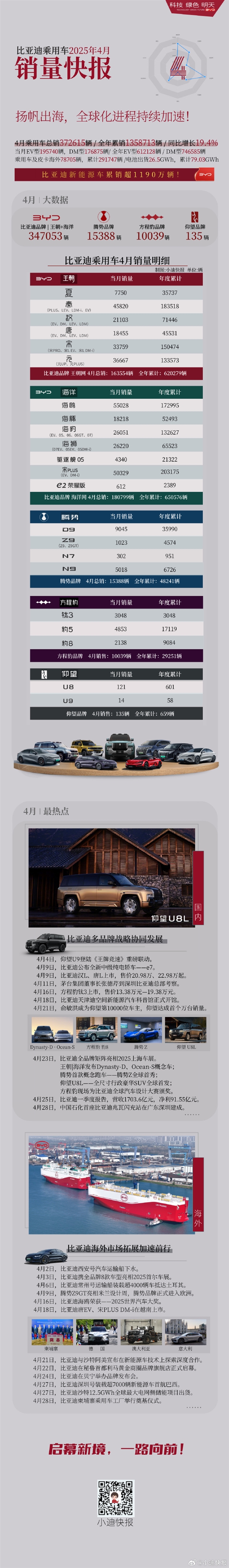 客畅网5月1日获悉,比亚迪最新公布的销售数据显示,2025年4月其全球总销量达到380,089台,较去年同期增长21.3%。